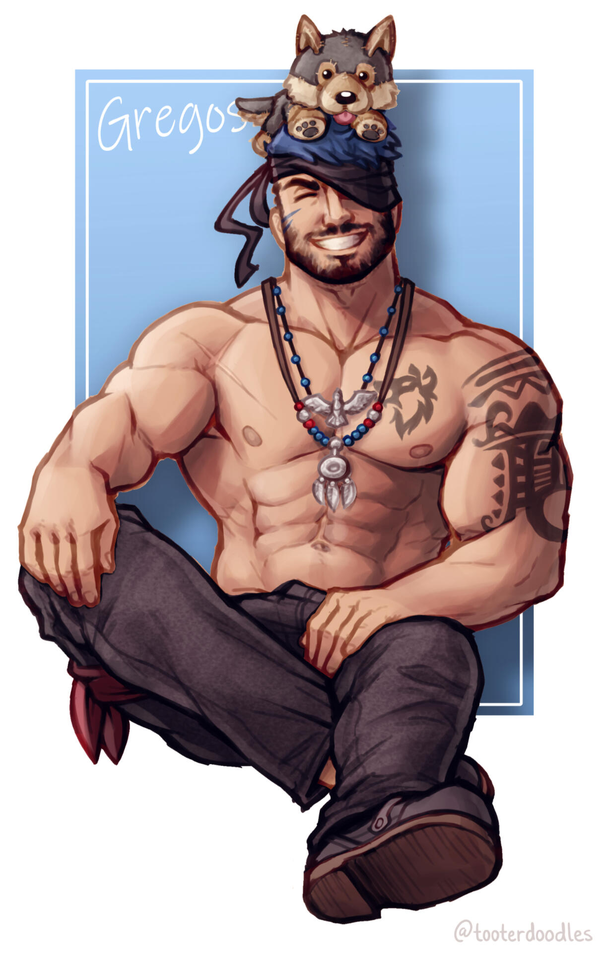 The son of Alistair and another Fist of Rhalgr. Gregos met N'hara in passing with the monk gatherings but had no idea that N'hara was the son of his lover until they ran into each other at Alistair's house.It was then that the two became better acquainted and bonded over food and stories. Their friendship was cemented when Gregos tore open his wound only to cared for by the half-highlander. Worried that Alistair would be upset to learn that Gregos was not careful with his injury, N'hara took it upon himself to use his knowledge in healing and first aid to patch the man's injury and prevent infection.The kindness that N'hara showed him that night would not be forgotten and Gregos is now more than ever determined to be a friend and ally to the half-highlander.