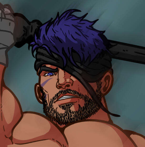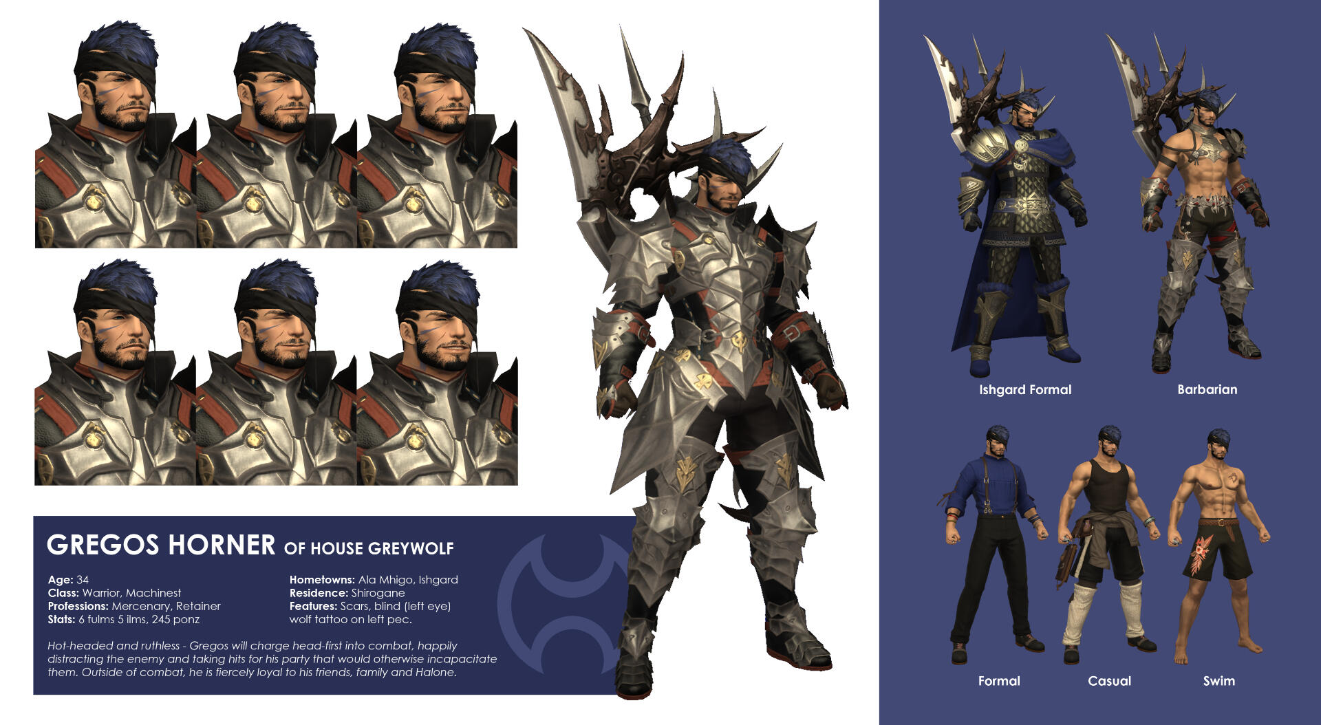 During the reign of King Theodoric of Ala Mhigo, Gregos' family left to find a better future in Ul'dah when he was a child. However, when they arrived in the desert city with nothing but the clothes on their back, they quickly found out they weren't welcome. They eventually found refuge with others like them at Little Ala Mhigo, deep within the desert.Gregos was raised by his strict father to be a warrior, like he was, and protect his family and the settlement from the Garlean patrols and desert monsters alike. Most of his entire life was spent in southern deserts of Aldenard, he yearned to see the world.Without his family's blessing, he left when Ishgard opened their gates to the rest of Eorzea. Over time he struck up a few friendships with those in the Skysteel Manufactory, though he spent most of his free time alone. During his years at Ishgard, he saved all of the gil he was earning through mercenary work in hopes of returning one day to Little Ala Mhigo.That plan shattered when he found out the Imperials murdered his family. Though he had no real love for Little Ala Mhigo or even his father, he took up his axe once again and joined the Resistance on his own terms.The highlander traveled far across Eorzea in an attempt to hunt down those responsible for his father's death. During a skirmish with a Garlean patrol, he released his inner beast, which caught the attention of a centurio and doctor who captured him and conducted experiments for weeks. Though Gregos escaped, he was never the same person and struggled to contain his sound mind when angered or upset.The highlander began a journey to find balance within and realized that structure in his life provided some relief from his internal turmoil. Gregos became deeply devoted to Halone during this time through the years found close friends who helped stabilize him.Now, the blue-haired highlander has better control to prevent his inner beast from taking over, but he still struggles to come out of the state when he falls into it. Only time will tell if Gregos can continue to undo the damage that was done to him - though if the Garleans have any say, he will be back within their labs.